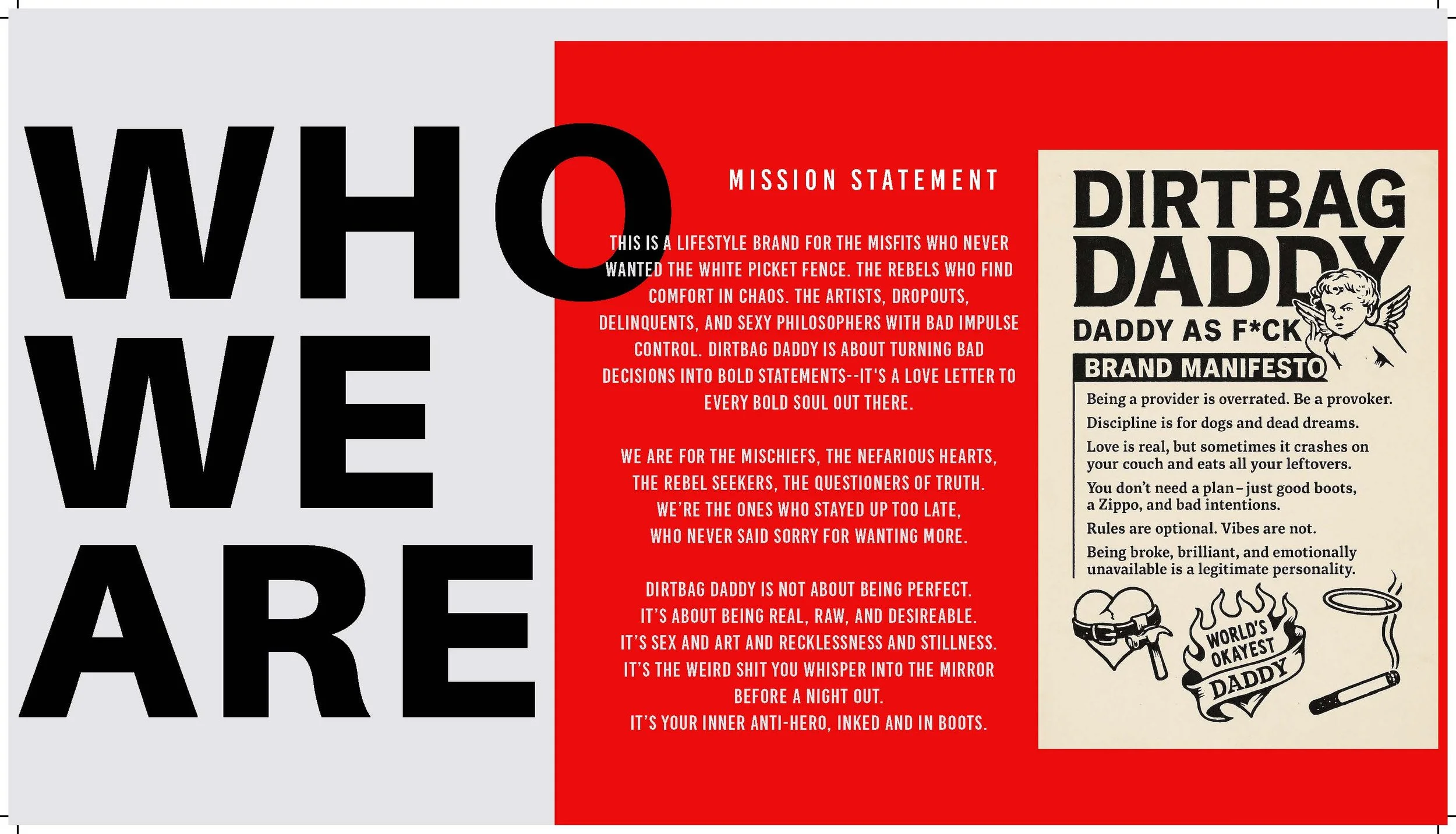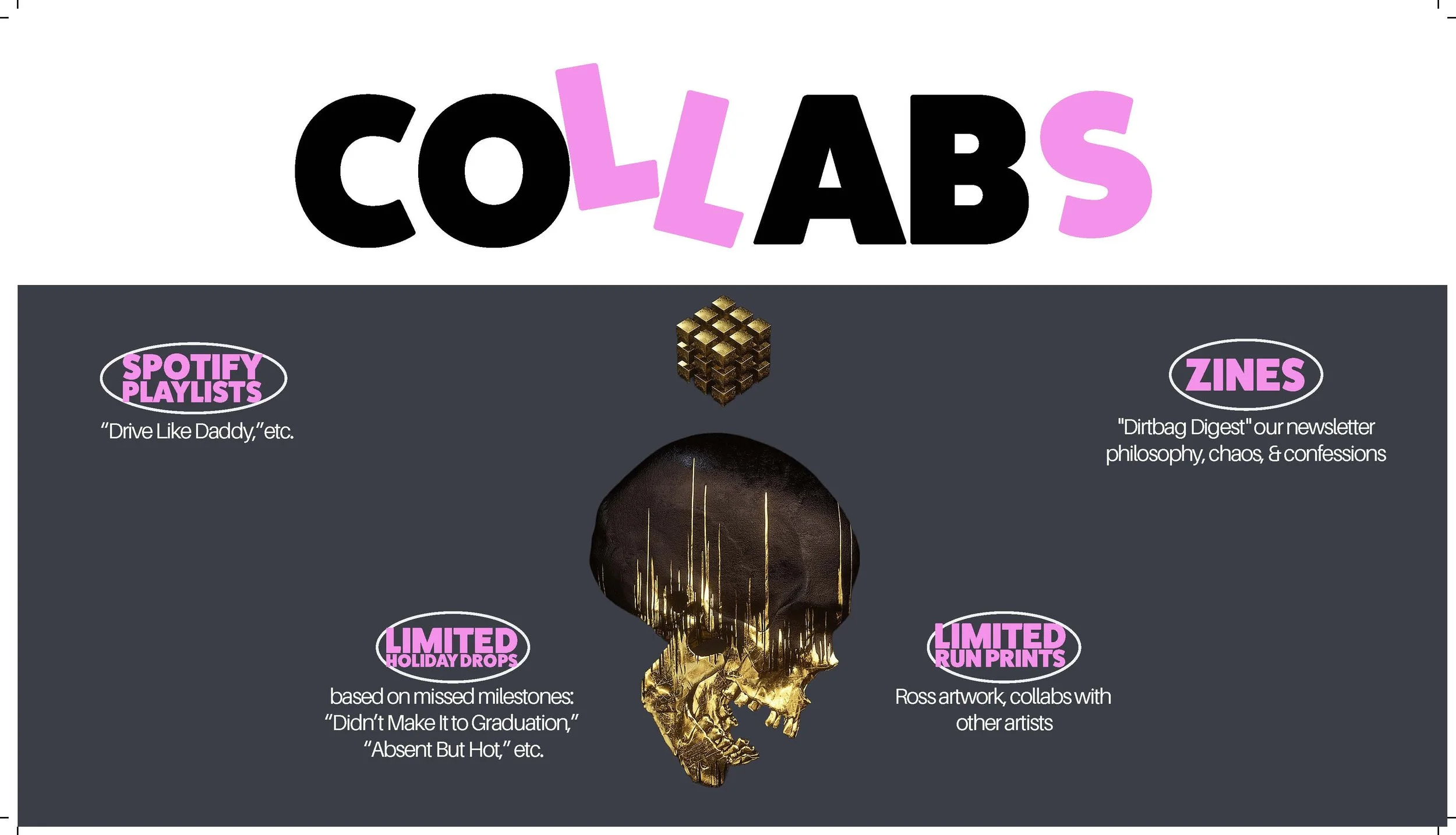 Built a rebellious, boundary-breaking lifestyle brand in partnership with artist Ross Pino. Developed the full creative universe—logos, illustrations, merch design, photography direction, social visuals, and event branding. The identity blends punk energy with cosmic symbolism, irreverence, and masculine-soft balance.
